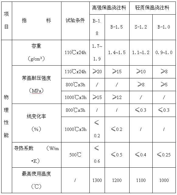 保溫澆注料系列產(chǎn)品理化指標(biāo)