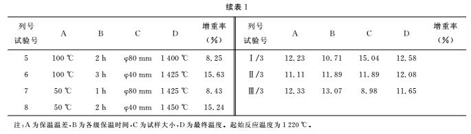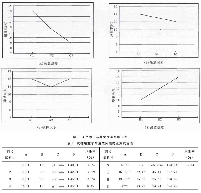 從表1和圖1可以看出,氮化硅結(jié)合碳化硅制品氮化燒結(jié)的主要影響因素是氮化反應(yīng)的時(shí)間,而兩級(jí)保溫之間的溫度大小和氮化燒結(jié)最終溫度的高低使這兩個(gè)因子對(duì)試樣增重率的影響相對(duì)較大。以上正交試驗(yàn)結(jié)果的分析,我們可以歸納出在氮化硅結(jié)合碳化硅材料的氮化燒結(jié)過(guò)程中:
